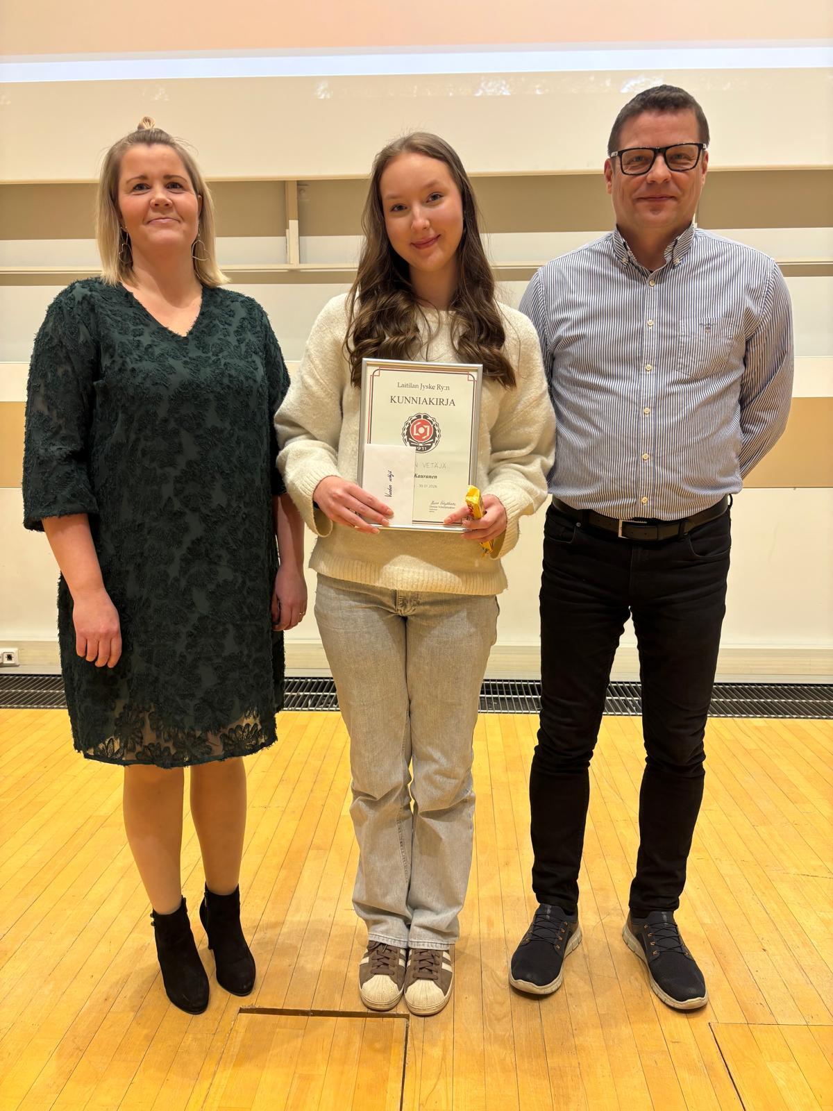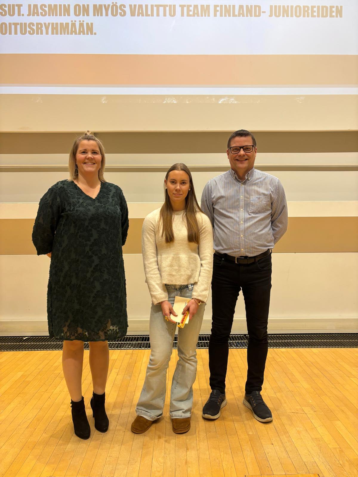 Vuoden nuoren urheilijan palkinnon sai Jasmin Vaskelainen. 15-vuotias pikajuoksija on kehittynyt määrätietoisesti päälajeissaan 100 ja 200 metrillä ja hänet on valittu Team Finland -junioreiden harjoitusryhmään.