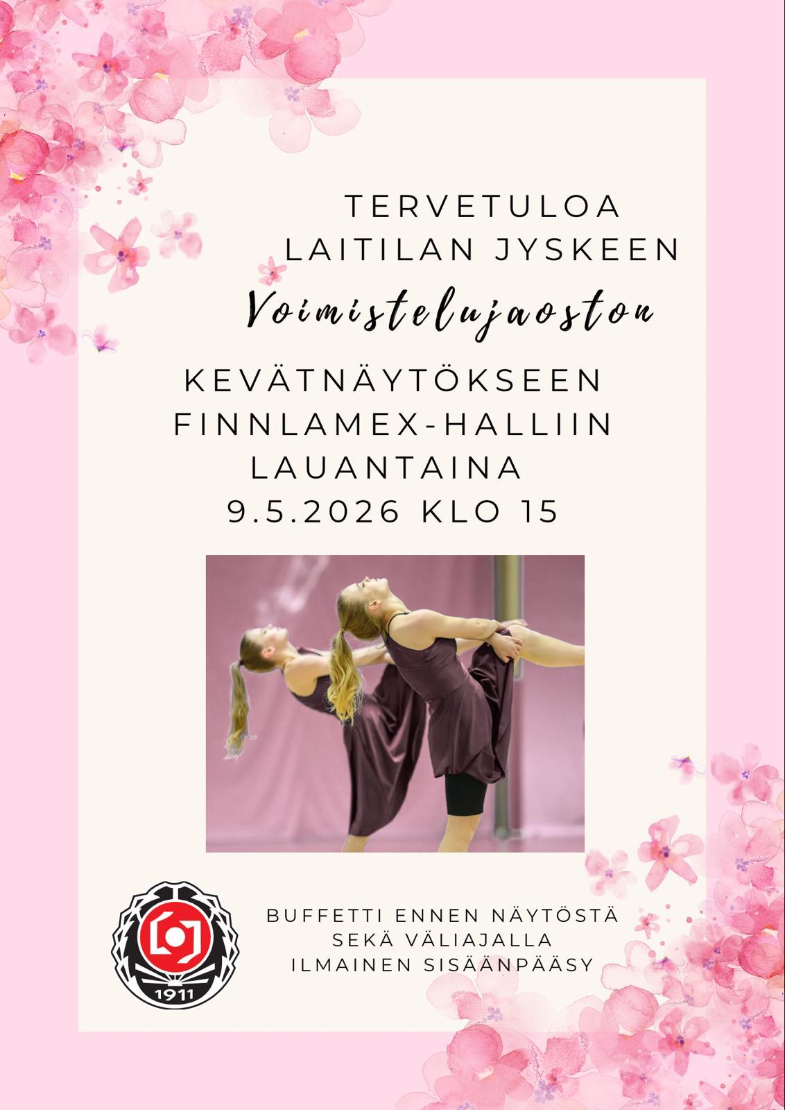 Voimistelujaoston kevätnäytös järjestetään perinteisesti toukokuussa Finnlamex - hallilla. Näytökseen on ilmainen sisäänpääsy. Väliajalla on buffetti.